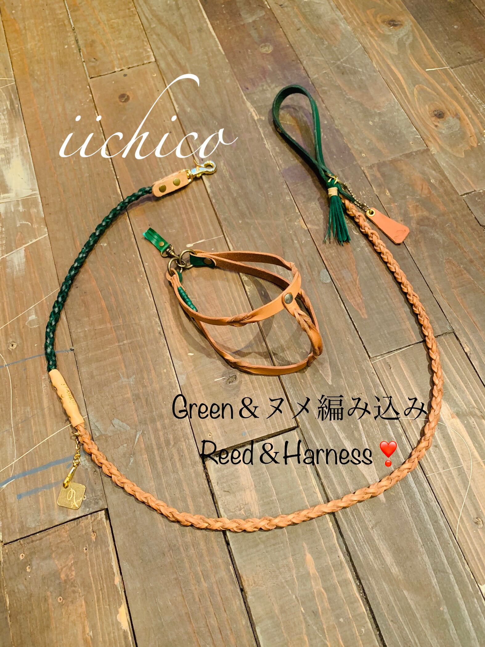 Green&ヌメ編み込みツートンのリード&ハーネスになります。